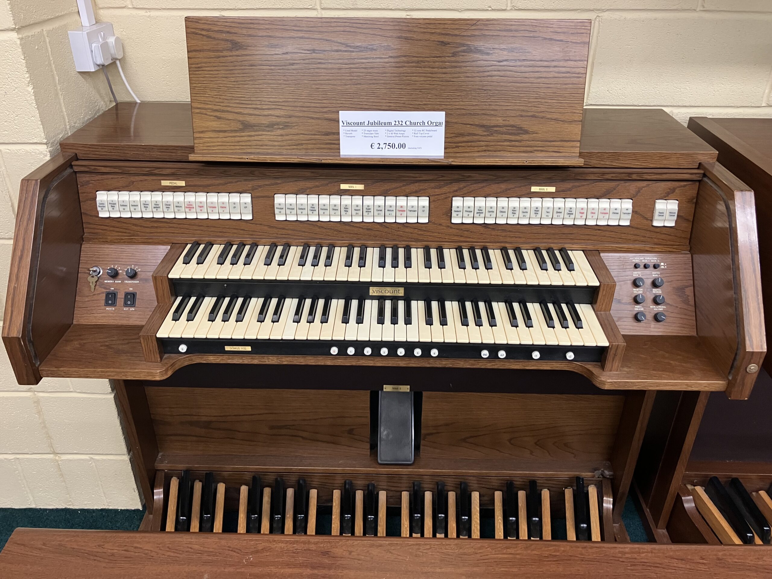 Used Viscount Domus Domus 1132 two manual digital church organ with 32 note concave radiating pedalboard in good working order. Features include; 2 x 61 note manuals, 37 light tab stop voices, independent tremulants for each division, MIDI, headphone socket for private practice, transpose control (-3 to +2), 6 x general piston registrations with six memory banks, matching bench and music desk included, a copy of the owners manual, romantic or baroque setting, Aux in & Aux out, 2 x 80 watt amplifiers, built internal speakers (2 x woofers, 2 x mid, 2 x tweeters), plus much more. An equivalent new Viscount model would cost €16,000